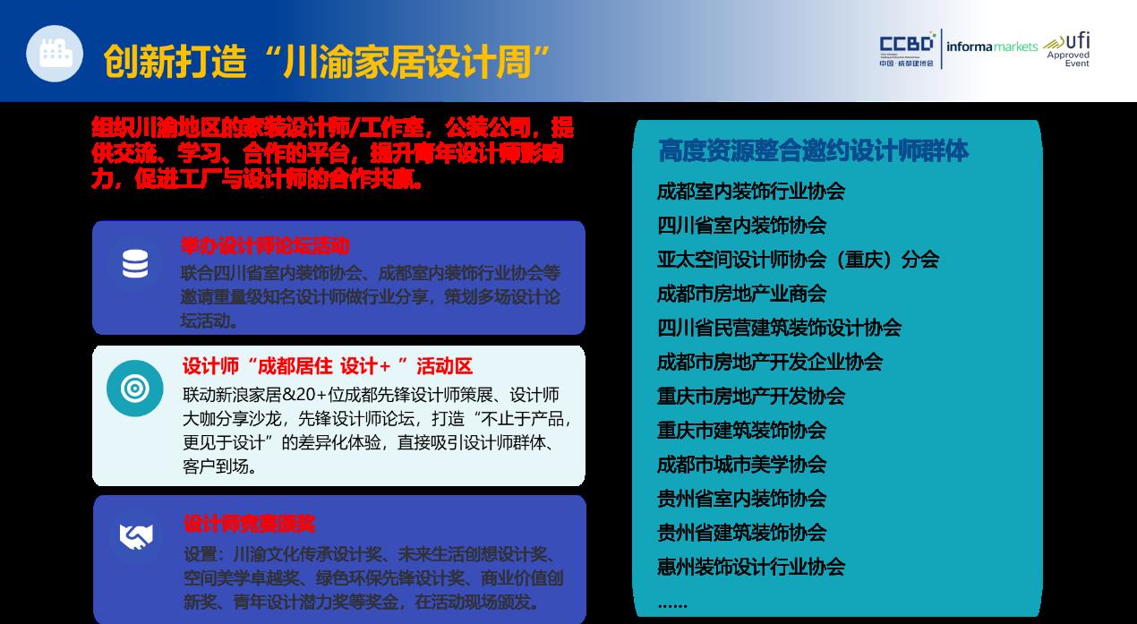 設(shè)計(ji)重(zhong)塑空間,美學(xué)賦能(néng)産(chan)業。作(zuò)爲(wei)“設(shè)計(ji)之(zhi)都”,成(cheng)都彙聚(ju)了(le)西南(nan)地區(qu)67%的(de)知名(míng)設(shè)計(ji)機(jī)構,創意資(zi)源富(fu)集(ji)。2026中(zhong)國(guo)成(cheng)都建(jian)博會創新(xin)打造(zao)“川渝傢(jia)居設(shè)計(ji)周”,聯(lian)郃(he)重(zhong)慶市(shi)建(jian)築裝(zhuang)飾協會、亞太設(shè)計(ji)師協會重(zhong)慶分(fēn)會、成(cheng)都市(shi)建(jian)築裝(zhuang)飾協會、四川省室內(nei)裝(zhuang)飾協會、成(cheng)都室內(nei)裝(zhuang)飾行業協會等(deng)權威機(jī)構,策劃多(duo)場(chang)設(shè)計(ji)主(zhu)題展(zhan)與專(zhuan)業論壇,推動(dòng)設(shè)計(ji)價值向産(chan)業價值高(gao)效轉化。